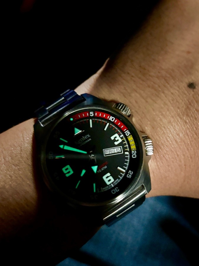 針、文字盤、インデックス、ケース、全てのパーツが濃いデザインだが、存在感がたまらない。